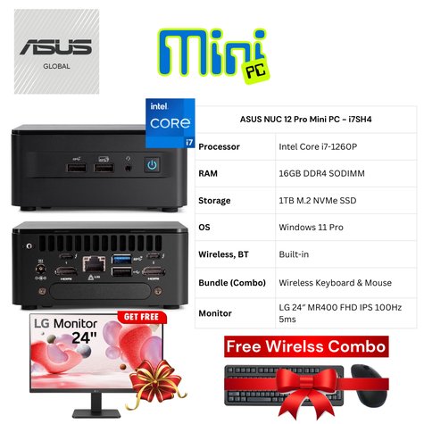 جهاز ASUS NUC 12 Pro Mini PC معالج Intel® Core™ i7-1260P ذاكرة RAM سعة 16 جيجابايت DDR4، بحد أقصى 64 جيجابايت قرص SSD سعة 1 تيرابايت M.2 NVMe نظام تشغيل ويندوز 11 برو 64 بت مجموعة لوحة مفاتيح وفأرة لاسلكية شاشة LG 24 بوصة MR400 FHD IPS بمعدل تحديث 100Hz