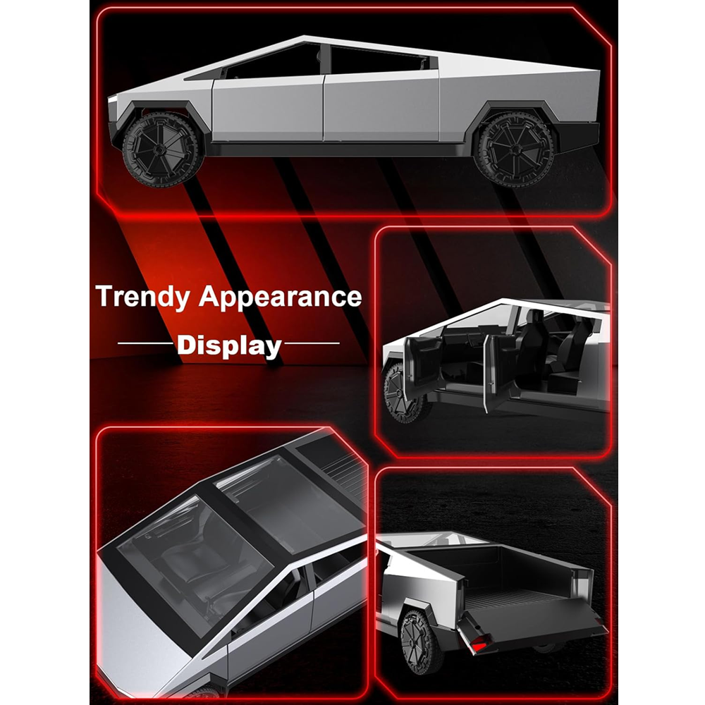 Well-made Cybertruck shape, metal panel material, LED headlights on, red taillights, four doors can be opened and closed, angular body design is more technological, and the ni pc details show good craftsmanship. Own it and feel the impact of reality and the future. Weight 1.8 kg, size 42.26 * 18.28 * 1.32cm, can decorate boys’ offices and boys’ rooms, very suitable for collection, business gifts, home decoration, office decoration, display.