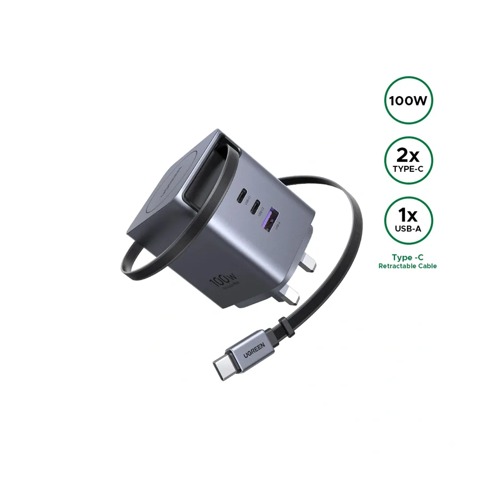 يو جرين (UGREEN) شحن 4 أجهزة في وقت واحد تقنية GaN، تصميم مدمج وكفاءة عالية شحن سريع بقدرة 100 واط وكابل قابل للسحب