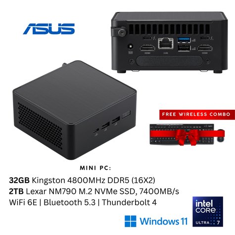 - ASUS NUC 14 Pro Mini PC Tall, Intel Ultra 7, 32GB RAM, 2TB NVMe SSD, W11Pro