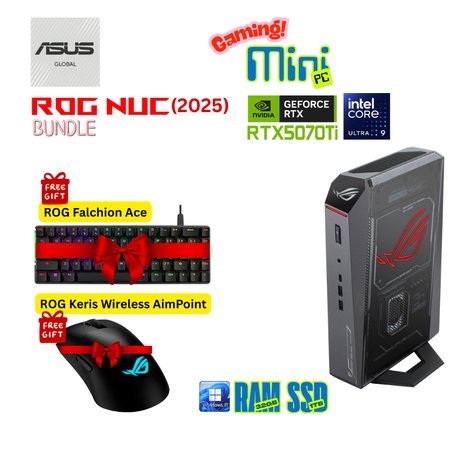 • ASUS NUC15JNK ROG NUC (2025) Bundle Gaming Mini PC, Intel Ultra 9, RTX 5070Ti, 32GB RAM, 1TB SSD, Win11, ASUS M602 Keyboard, ASUS P709 Mouse