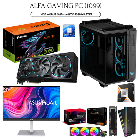 Alfa Gaming PC 1099 AMD 9900X3D, 16GB RTX5080, 96GB RAM, 2TB SSD, ASUS 27″ ProArt, ASUS TUF GT502, W11Pro