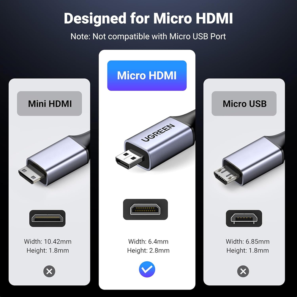 • 8K@60Hz Micro HDMI to HDMI Cable: UGREEN Micro HDMI cable supports 8K@60Hz, 4K@240Hz, and 4K@144Hz Full HD resolution. It can help you to stream audio and video from a camera, tablet or laptop through the Micro HDMI Port to Your HDTV or projector with an HDMI port. NOTE: Please pay attention to the interface of your device, micro HDMI port NOT mini HDMI or micro USB