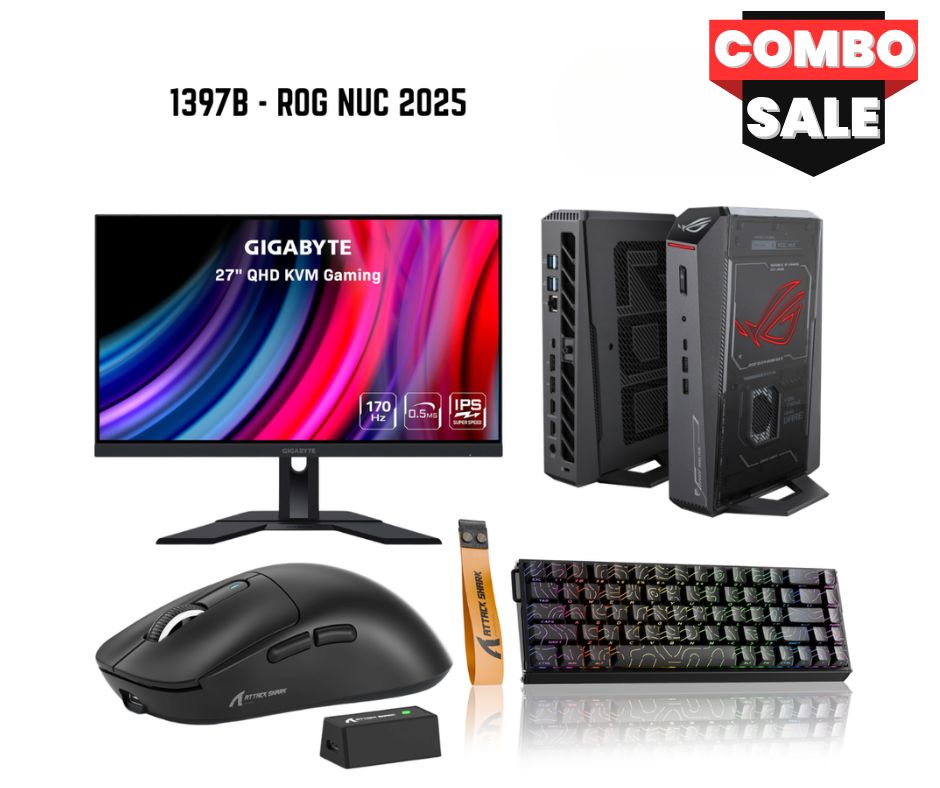 • ASUS Bundle 1397 ROG NUC (2025) Gaming Mini PC, Ultra 9, RTX 5070Ti, 32GB, 1TB NVMe, Gigabyte 27″ M27Q, Attack Shark X68MAX, X3PRO
