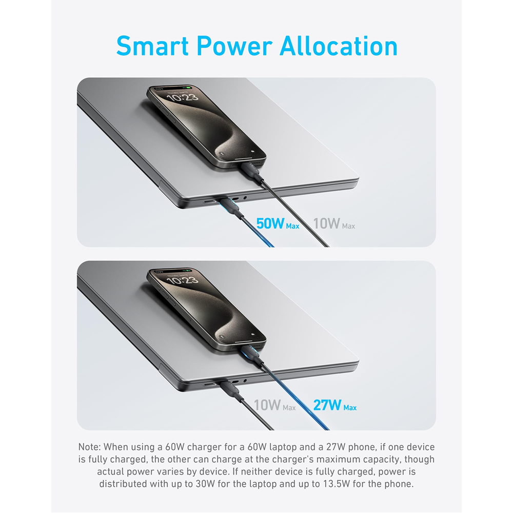 Intelligent Distribution of Power: Built-in smart power management adapts power output to match the charging requirements of each connected device seamlessly. Note: Please refer to the charging guide to understand the power allocation when charging two devices at the same time.